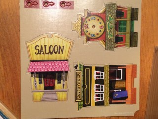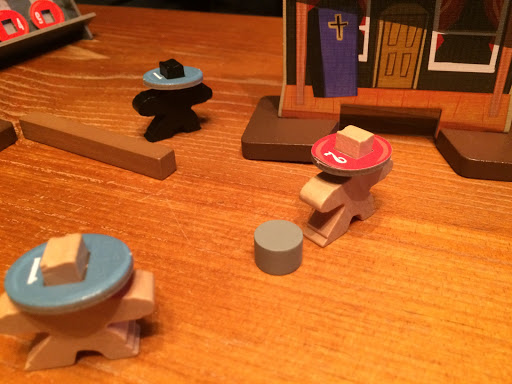 How do you shoot? You put down a little bullet token by the side of the character and flick it. If you knock the opposing character over, you cause a wound – if you hit it but don’t knock it over, it’s a glancing shot and no damage is done. Too many wounds and the character dies. If you go into a building where an opposing character is hiding out, you have a duel where each takes a shot at the other over an ever-decreasing distance until one character is hit. If your bullet ever hits something before hitting a character, there’s no damage, at least in the basic game. And you can’t shoot a man when he’s down.