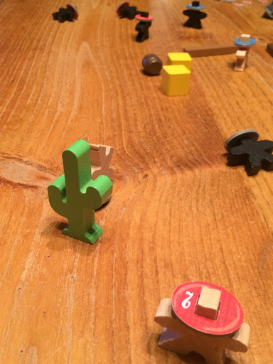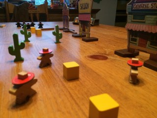 Design: 4/5 – This game oozes class. It feels like classic Westerns and puts you right in the action. There’s nothing fancy but the combination of wooden figures and cardboard buildings works perfectly.