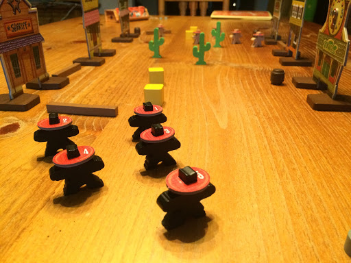 Duels are great. It’s worth running into a building just to do them. In our last game, I ran into a building with three opposing law-breakers. Pow! I shot the first one dead. The other two fired back and missed. We drew closer. Second shot I missed and they both fired back, missing. We drew closer. Blam! I nailed that villainous Old Man Cooper and sent him packing. His henchman fired and missed. We draw closer. I fired again and sent his henchman straight to hell. Three on one and I popped them all. That’s what a great evening’s gaming is made of.