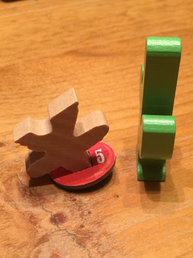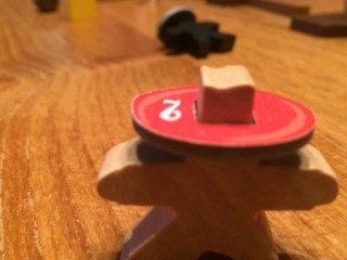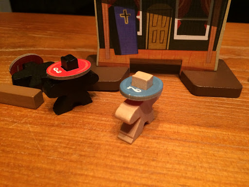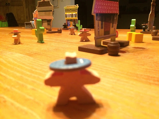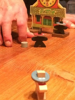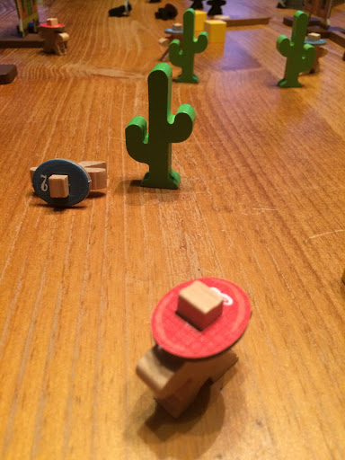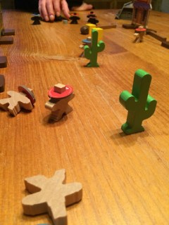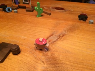Everything about this game is classy. The wood is simple yet effective, weighty yet capable of being flicked over. Where earlier scenarios involve just killing certain people (the first scenario has the victory condition of killing 3 opposing characters while the second has you having to kill one specific lead character), later ones get more complex, involving dynamite, rifles, bags of money and much more. Each scenario builds up nicely, allowing for a gradual increase in complexity. At the same time, though, the core mechanic is extremely simple – flick a bullet at another cowboy to kill him. I’ve seen reviews of this game that express real frustration because sometimes it gets a little fiddly – a building might get in the way, the angle may be horrible or you may miss every shot in a round. But that’s what makes this game great, because when you hit it feels GREAT. And that’s the joy of dexterity games. You don’t have to be a great military strategist, you just need to be able to flick a token.