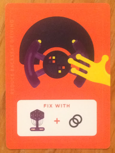 Take this malfunction, for example. You need two tools to fix it – in this case, one has to be a specific tool and the other symbol on this card is a representation of a tool type, like suits in a normal deck of cards. But look at the picture on the left. You’re asking your crew mates sitting around the table for it. How would you describe it? “The thing with a box and wires that’s standing on a stand”? That’s where the fun comes in. You’re all badly describing tools that you need from each other at the same time. So, you’re speaking and listening and swapping cards all at the same time. That’s what makes this game crazed and loud – personal experience suggests it’s not one to play with the kids asleep in a nearby room!
