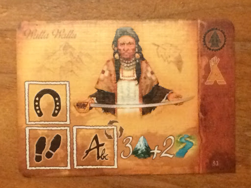 Each of the 55 cards that come with the game are double-sided. On the Tribe side are descriptions of American Indian tribes that you can encounter. Here, for example, is a card of the Walla Walla tribe. And yes, that’s a real name of a real tribe… don’t be so culturally insensitive! On the top right of the card is one of two symbols – in this case, it’s the symbol depicting a Wary Tribe, which means that to befriend it you need to spend two Negotiate dice (that’s a die with an American Indian symbol on it), instead of only one for a Friendly Tribe. Under that is a picture of a Tepee. The player who collects the most tepees during the game scores points. The bottom of the card explains what you can do once you befriend this tribe. In this case, if you put down one Ride, one Walk and one Journal die (the Journal die must always be put down last), then you can travel for three mountains and then two rivers. What does that mean?