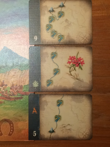 Having to choose Tribe cards adds another dimension to the game. Do you befriend, for example, a Friendly tribe (costing only one Negotiate die) that gives you a tepee and allows you to spend 3 Walk and 1 Journal to go either 3 rivers or 2 mountains, or a Wary tribe (costing two Negotiate dice) that gives you a tepee and allows you to spend two Walk dice and a Journal die to travel 3 mountains, or do you befriend a Wary tribe (on the bottom of this picture) that allows you to spend just one Journal die to explore 2 rivers? Tough choice. I would probably take the bottom card, but don’t trust me entirely because I’ve never actually won at this game.